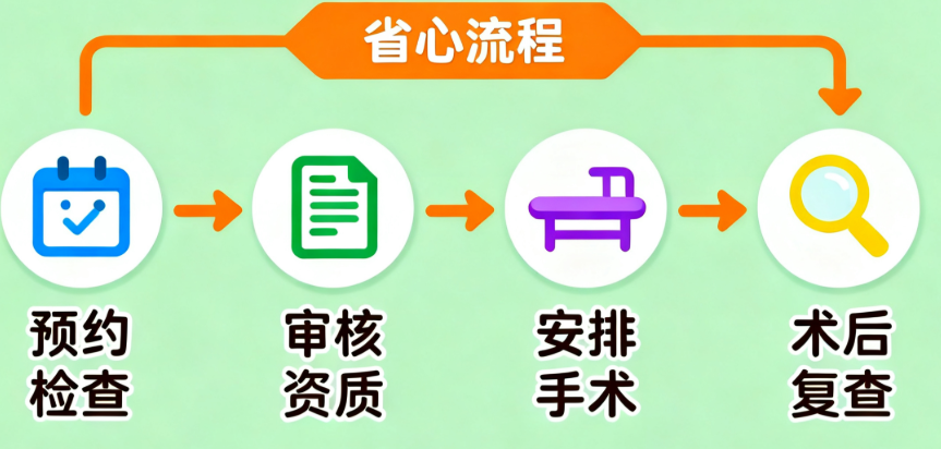 - 步骤4:手术安排:检查合格者,医院在10个工作日内通知手术时间。手术需家属陪同。