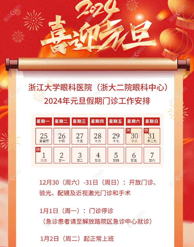元旦假期浙大二院眼科医生出诊时间表,近视手术可约30/31日